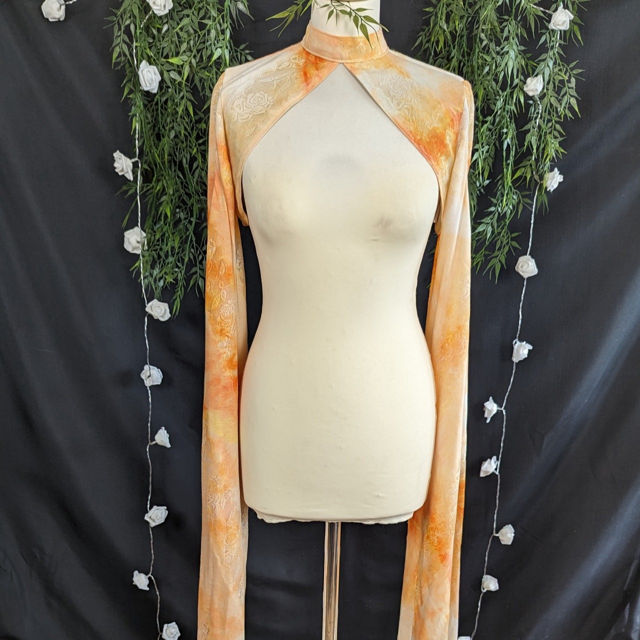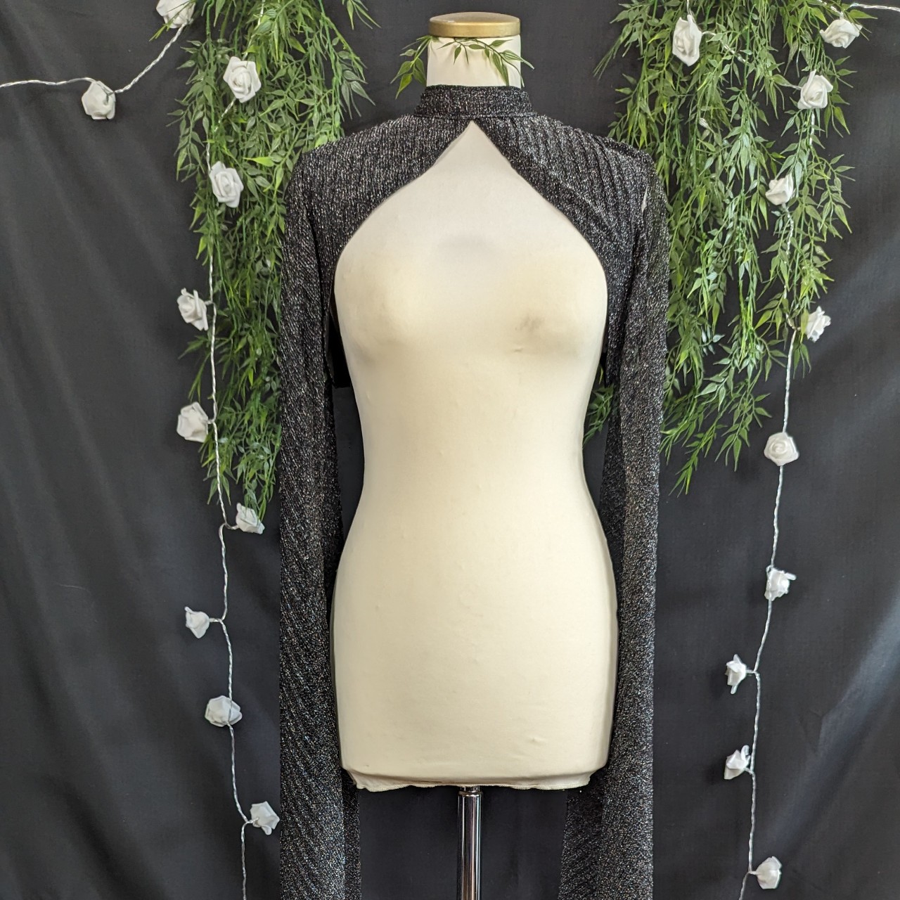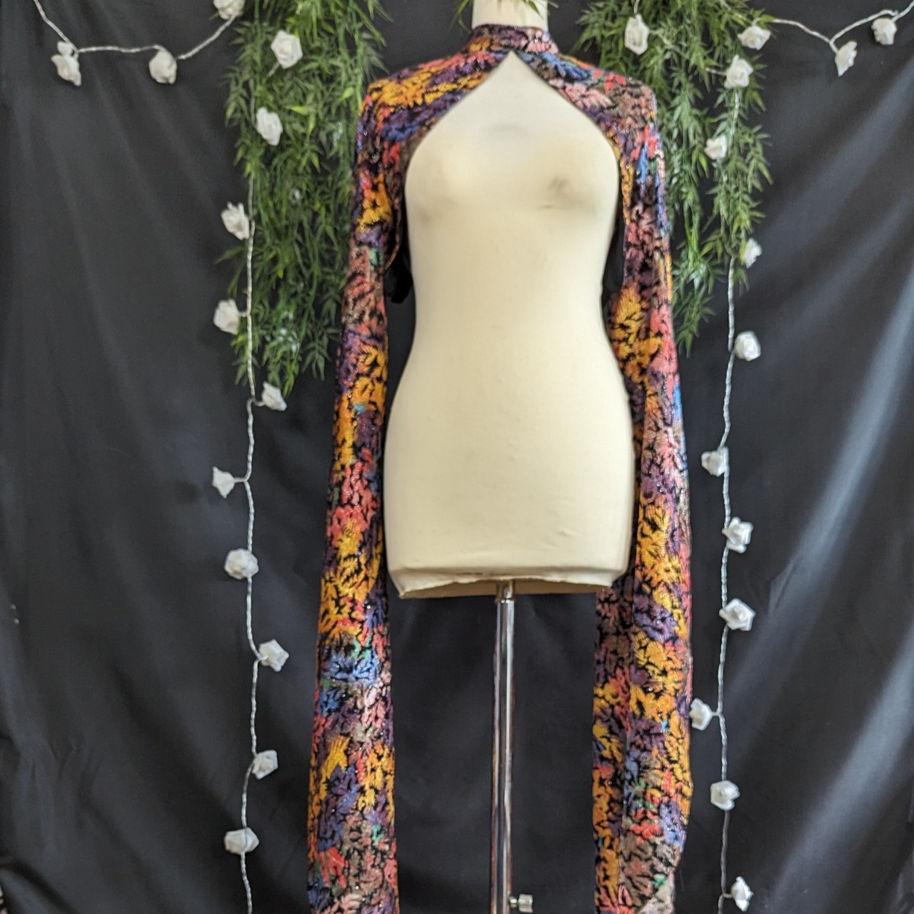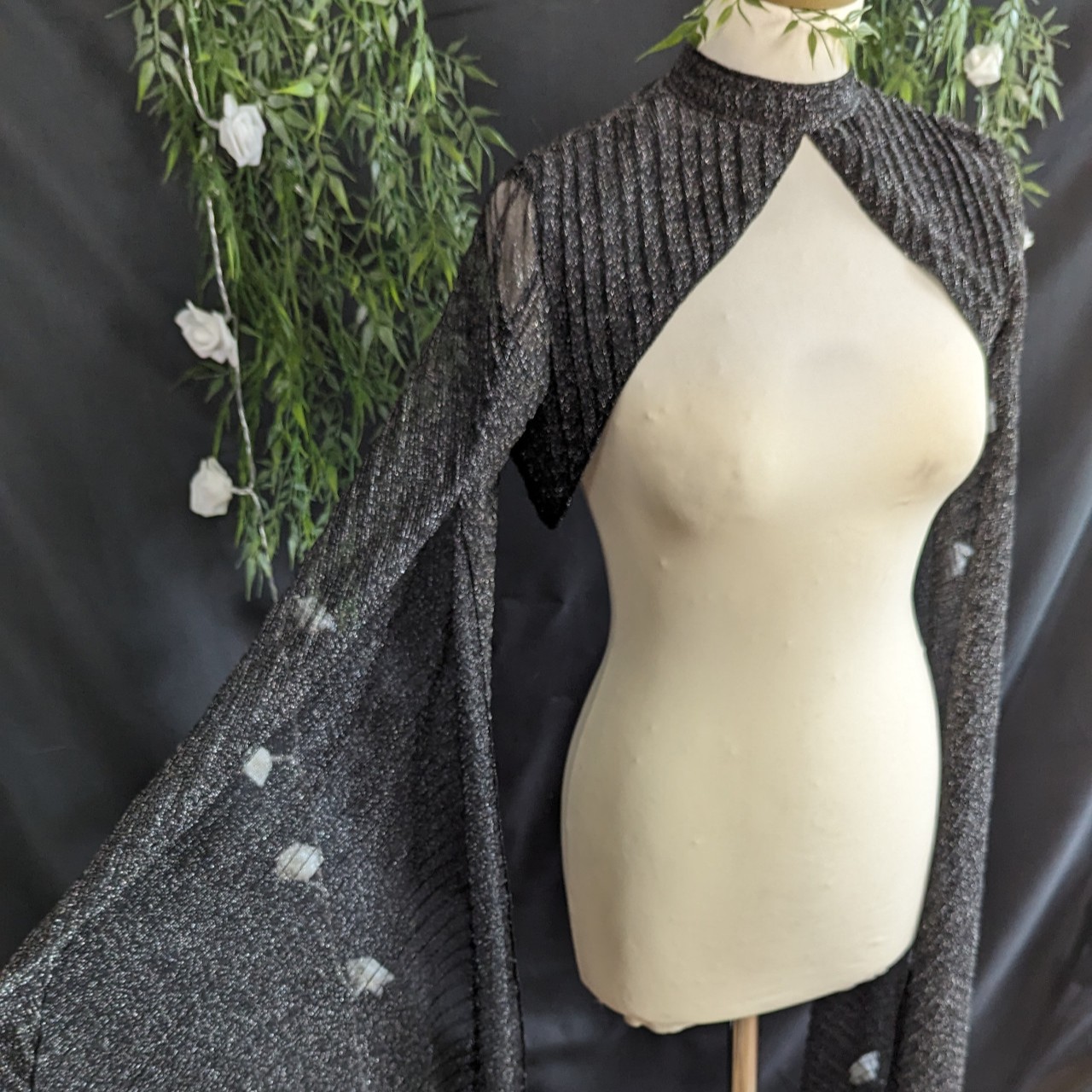 Bolero à manches longues ouvertes pour laisser apparaître le bras.